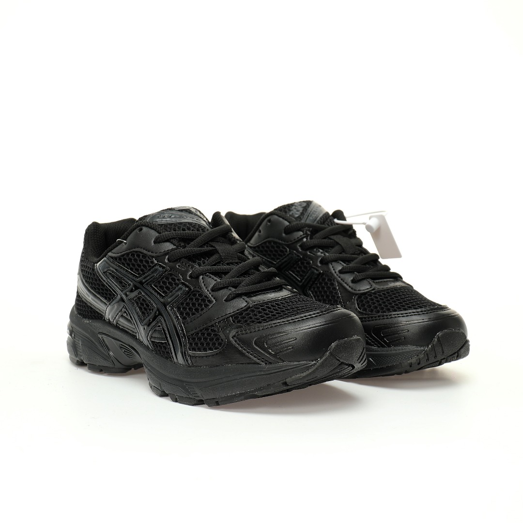 The ASICS Gel-1130 Black Graphite Gray sneaker celebrates nine generations of design evolution with a sustainable, modern aesthetic. Crafted with over 20% recycled materials, it features a sleek black and graphite gray color scheme. GEL technology in the heel provides cushioning and comfort, while the TRUSSIC support arch enhances stability. This versatile shoe is perfect for both sports and everyday wear.